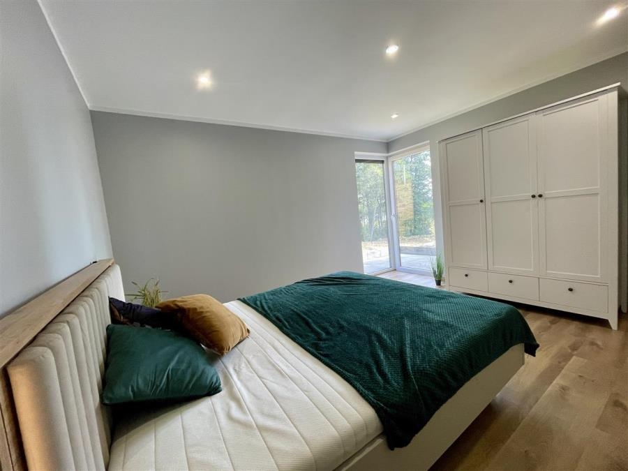 - Przestronny salon z dużymi przeszkleniami prowadzi na 50-metrowy taras z panoramicznym widokiem na taflę jeziora — idealny na poranną kawę, rodzinne spotkania czy romantyczne zachody słońca,