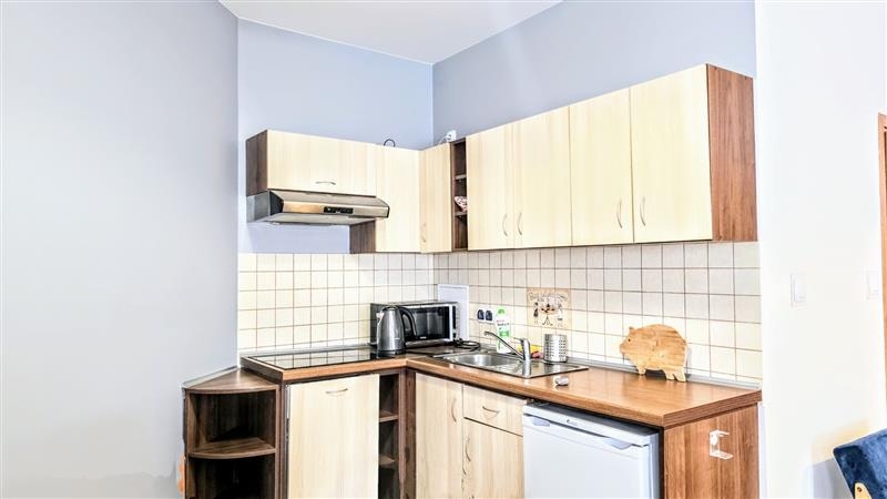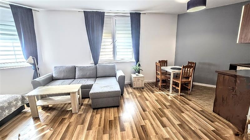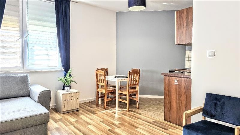Bardzo ładnie doświetlony. W oknach żaluzje. Kuchnia zabudowa kuchenna, płyta indukcyjna, lodówka, mikrofala, czajnik elektryczny, stół, krzesła.