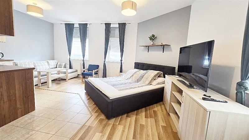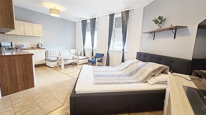 W pokoju łóżko sypialniane i kanapa narożnikowa co pozwala na wynajem rodzinie. Wszystko zostaje w cenie lokalu.
