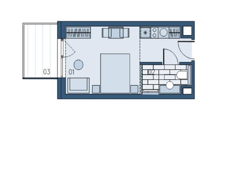 Pokój dzienny z aneksem kuchennym (18,61m2), łazienka (3,58m2).