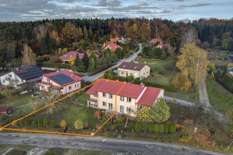 Działka o pow. 696 m2; ogrodzona i zagospodarowana (trawniki, nasadzenia, polbruk).