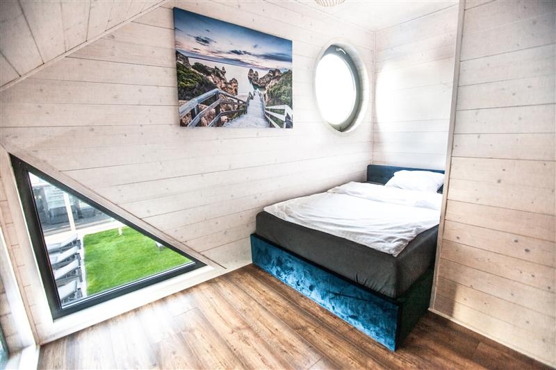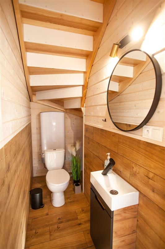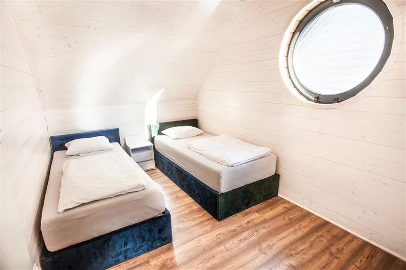 Domki w pełni wyposażone, na parterze do dyspozycji gości salon z aneksem, sypialnia i Wc, schodami wejdziemy na piętro z dwoma sypialniami i łazienką. Każdy domek posiada taras z miejscem z