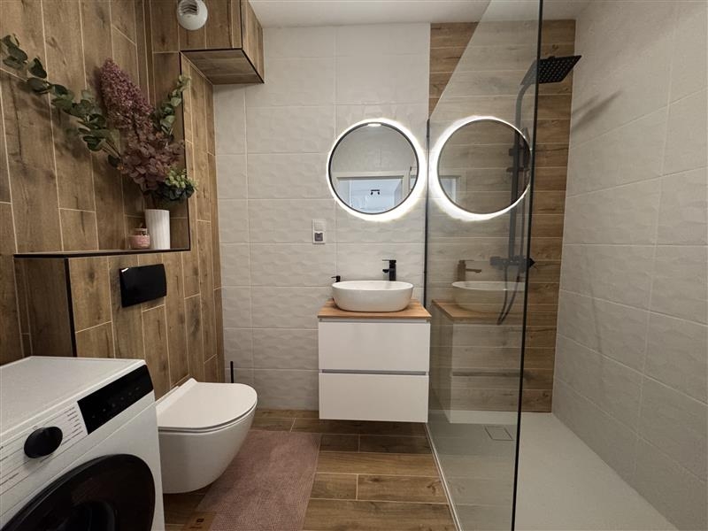 Łazienka z wc (prysznic, umywalka, szafka, lustro, wc, pralka).