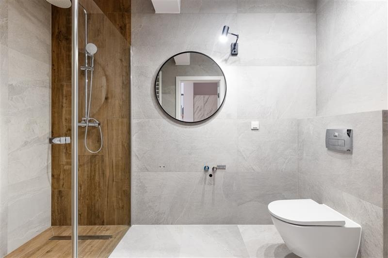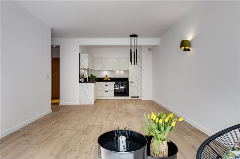 Lokal został wykończony pod klucz, z wysokiej jakości materiałów. Drzwi marki Dewro, włoskie płytki Marazzi i Imola w łazience i na podłogach w całym mieszkaniu, kuchnia oraz inne meble firmy Haecker, nowy sprzęt AGD w kuchni marki Bosch/Siemens, ceramika Duravit, oświetlenie Nowodvorski i AQform.