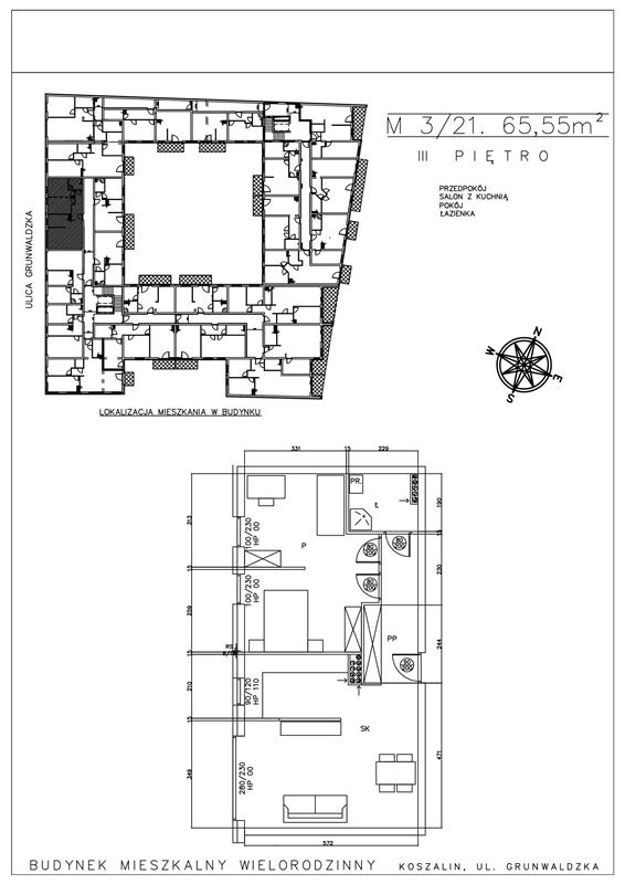 Prezentowane w ofercie mieszkanie o powierzchni 65,55m2, usytuowane jest na III piętrze, składa się z salonu z aneksem kuchennym, pokoju, łazienki oraz przedpokoju.