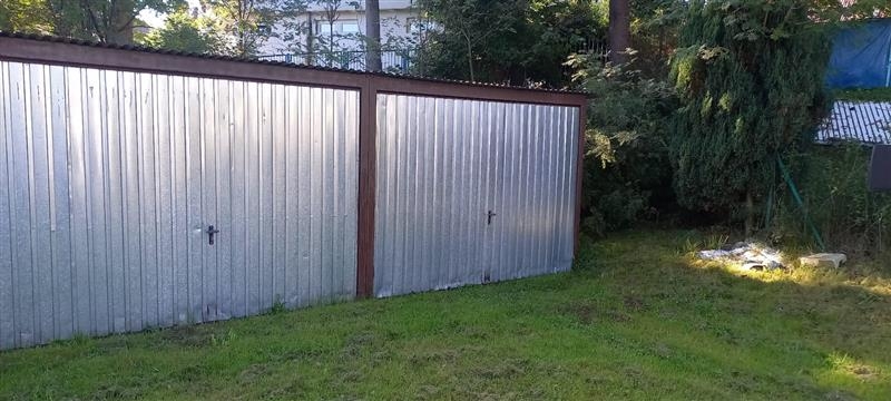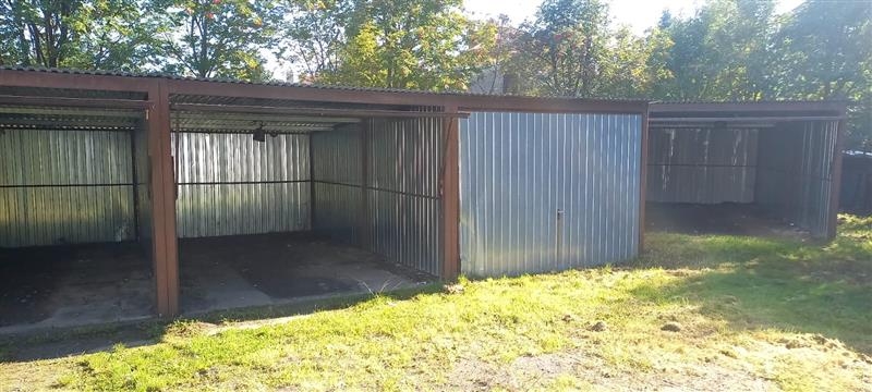 Na działce znajduje się 10 garaży, każdy o wymiarach 5,5 m x 3 m z bramą unoszoną do góry.