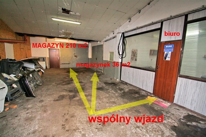 Do magazynu wjeżdża się przez bramę (3 na 3 metry) do części wspólnej magazynu, w której znajdują się: wejście do biura, oraz bramy (3 na2,80 m) do magazynów.