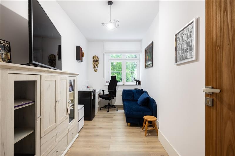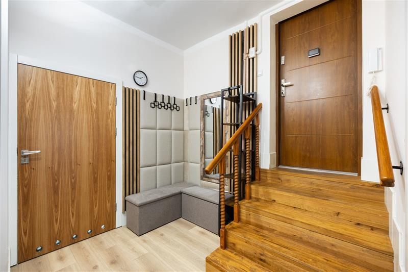 oraz pełen zestaw nowoczesnego sprzętu AGD, który pozostaje w cenie nieruchomości. W przedpokoju znajduje się