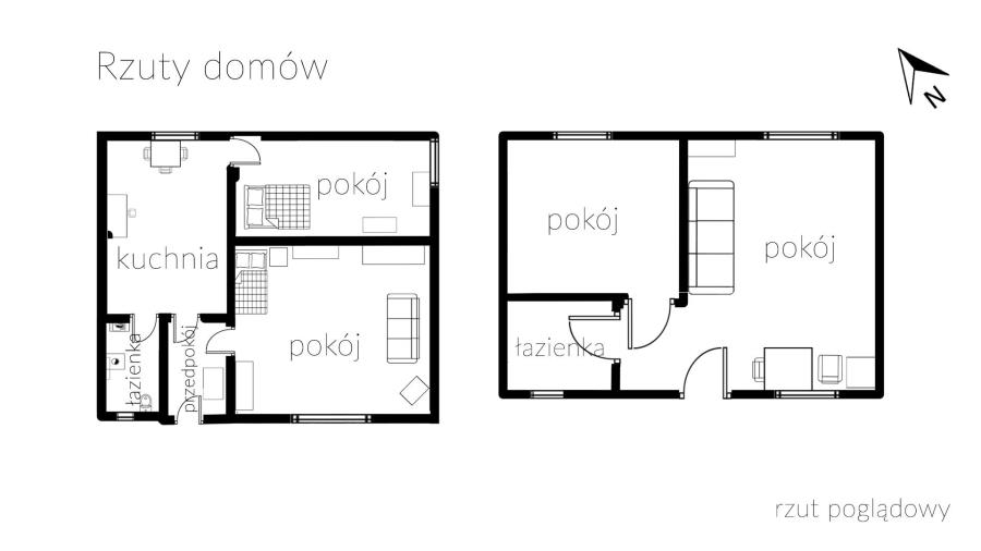 Parter domu: pokój dzienny, sypialnia, kuchnia z jadalnią, łazienka, przedsionek.