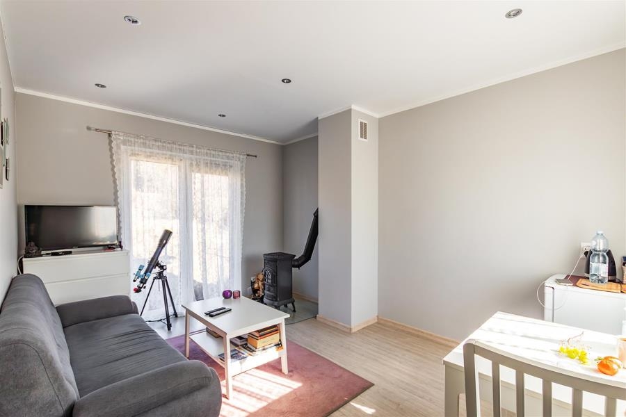 Parter budynku: salon z piecem kominkowym, sypialnia, łazienka.