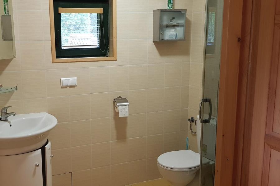Domki turystyczne konstrukcji drewnianej, dach ocieplony wełną mineralną, pokryty blachodachówką.