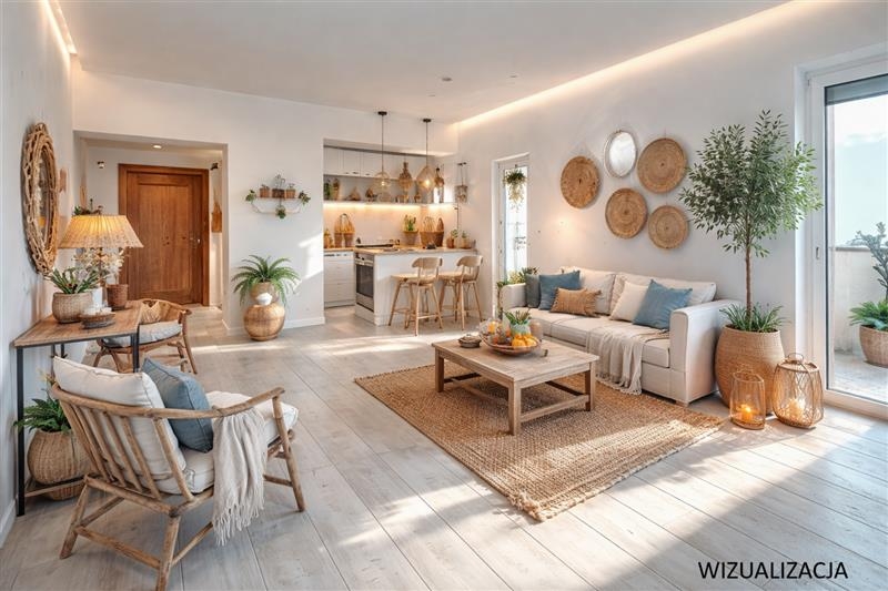 Wnętrze lokalu zostało zaprojektowane w sposób prosty i funkcjonalny. Główną część stanowi duży pokój z aneksem kuchennym, który pozostaje do wyposażenia we własnym zakresie.