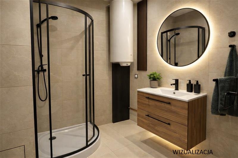Łazienka wyposażona jest w kabinę prysznicową, umywalkę z szafką oraz bojler odpowiadający za podgrzewanie ciepłej wody. W przedpokoju znajduje się praktyczna szafa w zabudowie, zapewniająca miejsce do przechowywania bez zajmowania powierzchni części dziennej.