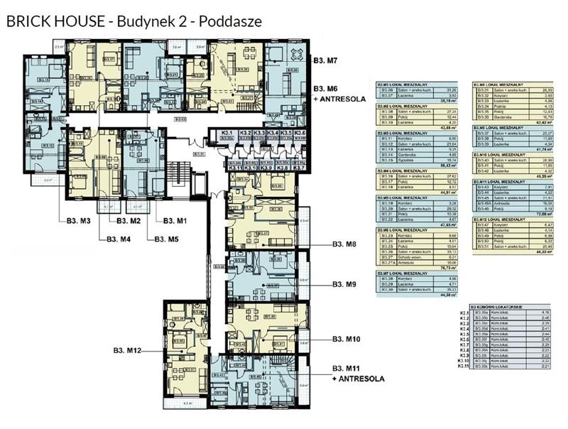 Mieszkanie B3.M11 składa się z salonu połączonego z aneksem kuchennym o pow. 31.51 m2, pokoju o pow. 9.10 m2, antresoli o pow. 19.04 m2, łazienki o pow. 4.52 m2, korytarza o pow. 7.91 m2. Mieszkanie posiada loggię o pow. 6.90 m2.