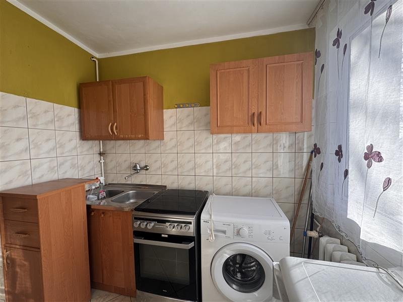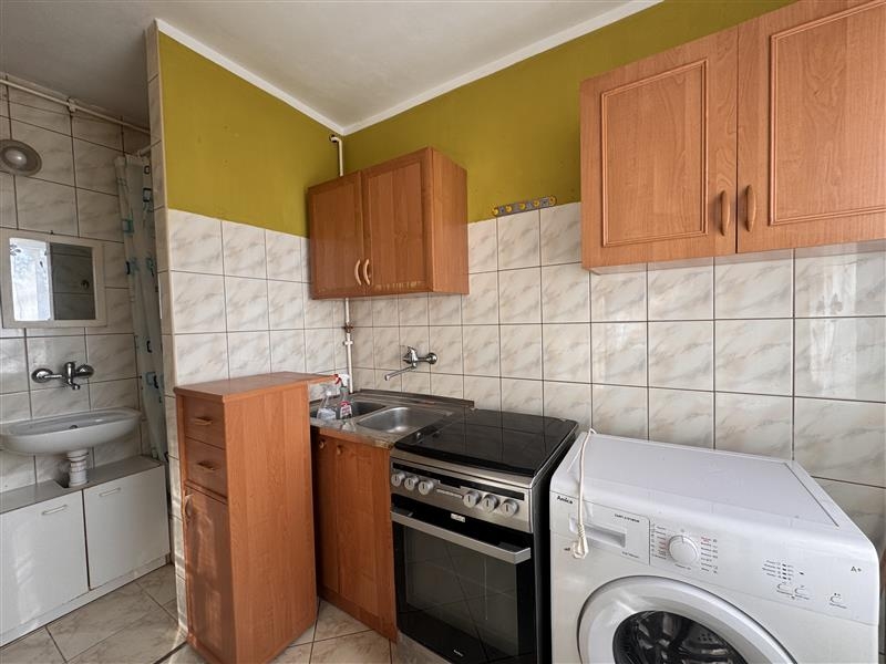 - w kuchni - meble kuchenne, kuchenka gazowa z piekarnikiem, zlew, mała lodówka, pralka, oświetlenie.
