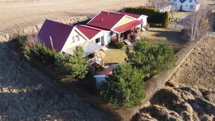 - 1 budynku letniskowo-mieszkalnego o konstrukcji drewnianej, parterowy z poddaszem użytkowym wybudowany w 2018r. Całość o powierzchni użytkowej 45m2. Obiekt całoroczny z ogrzewaniem w postaci tzw. kozy.
