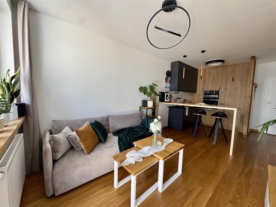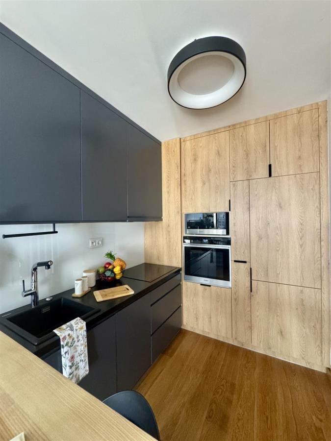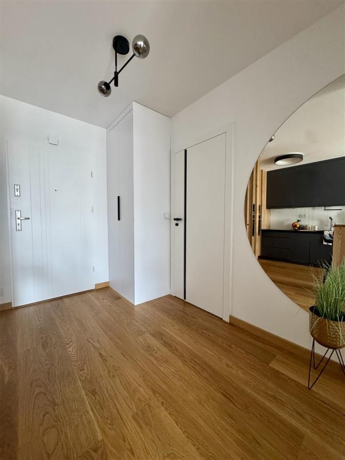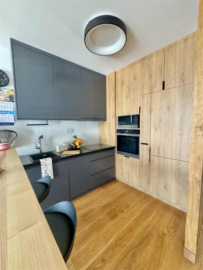 Mieszkanie zostało wykończone z dbałością o każdy detal, przy użyciu wysokiej jakości materiałów. Na podłogach położono naturalną deskę drewnianą, kuchnia wyposażona jest w drewniane blaty, a całość dopełniają solidne i eleganckie drzwi Porta. Wnętrze jest spójne, nowoczesne i gotowe do zamieszkania – bez konieczności ponoszenia dodatkowych nakładów finansowych.