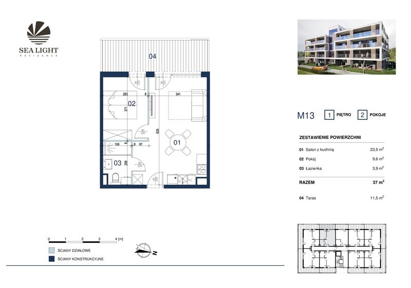 Prezentujemy dwupokojowy  apartament o powierzchni 37 mkw z tarasem położony na pierwszym piętrze.